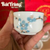 Họa tiết hoa đào xanh được các nghệ nhân Bát Tràng vẽ tay hoàn toàn bằng men lam xanh ngọc, từng nét vẽ mềm mại, sống động. Hình ảnh hoa đào tượng trưng cho sự may mắn, thịnh vượng, được nhấn nhá thêm bằng đường viền chỉ đỏ tinh tế ở miệng chén, tạo nên một tổng thể hài hòa và sang trọng.
