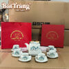 Bộ ấm chén trà in logo đầy đủ bao gồm 1 ấm, 6 chén và 7 đĩa kê với thiết kế đồng bộ, vuông vắn. Tất cả được đặt trang trọng trong hộp quà tặng xi lót lụa cao cấp, sẵn sàng để trở thành món quà ý nghĩa.