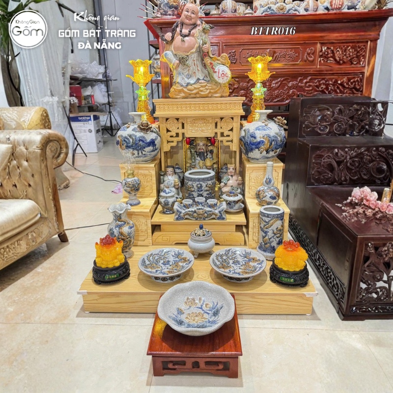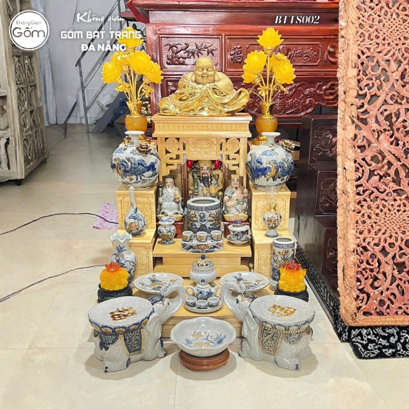 Showroom Không Gian Gốm Đà Nẵng cung cấp trọn bộ vật phẩm thờ tự đồng bộ: bát hương, mâm bồng, bộ kỷ chén, chóe thờ, đèn thờ, bộ đỉnh hạc,…