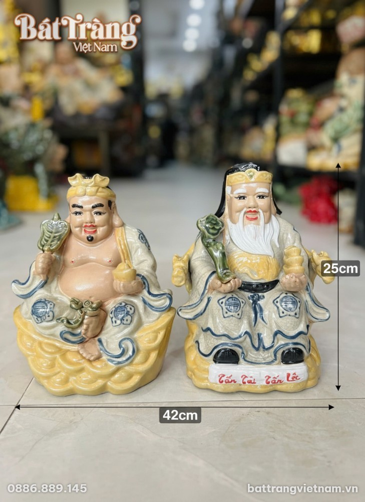 Mỗi chi tiết trên cặp tượng Thần Tài – Thổ Địa men rạn màu vàng nhạt BT-TTTĐ05 đều là minh chứng cho tài hoa của nghệ nhân Gốm Bát Tràng Việt Nam. Tượng Thần Tài được khắc họa với thần thái phúc hậu, nụ cười hoan hỉ, bụng lớn tượng trưng cho sự sung túc, tay cầm thỏi vàng và quạt ngọc như ý, sẵn sàng ban phát tài lộc. Bên cạnh là Ông Địa hiền từ, với bộ râu trắng dài, nụ cười an nhiên, tay cầm gậy như ý và thỏi vàng, biểu trưng cho sự bảo vệ đất đai, nhà cửa và mang lại bình an.