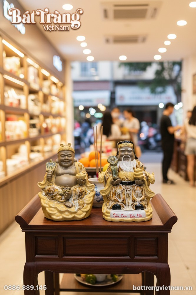 Thần Tài và Thổ Địa là hai vị thần bảo hộ không thể tách rời trong văn hóa phương Đông, đặc biệt quan trọng đối với những người làm ăn kinh doanh. Tượng Thần Tài với nụ cười hoan hỷ, tay cầm gậy như ý và thỏi vàng, tượng trưng cho sự giàu sang, phú quý và khả năng chiêu tài mạnh mẽ. Ngài mang đến vận may tài chính, giúp công việc kinh doanh thuận lợi, phát đạt.