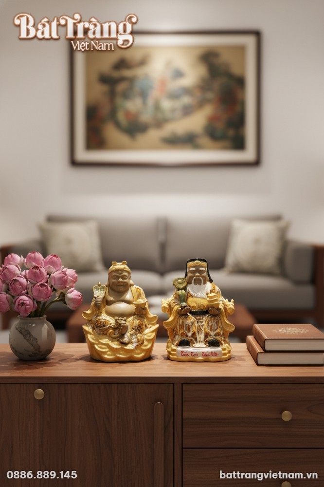 - Bàn thờ Thần Tài – Thổ Địa: Đây là vị trí trang trọng nhất, nơi gia chủ thể hiện lòng thành kính và cầu mong sự phù hộ. Đặt tượng ở nơi sạch sẽ, thoáng đãng, hướng ra cửa chính hoặc cửa sổ để đón khí tài lộc.